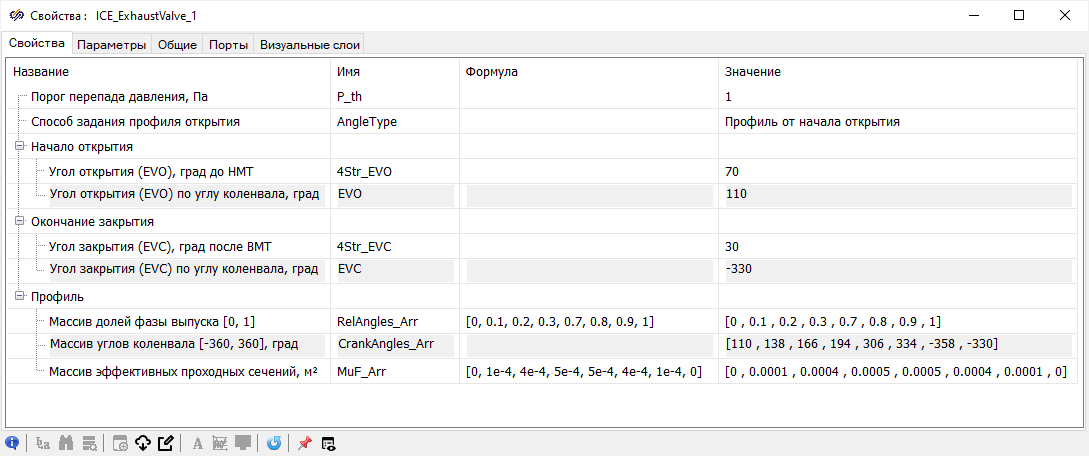 Геометрические характеристики цилиндров задаются централизованно в блоке Геометрические характеристики. Для каждого цилиндра необходимо задавать только профили открытия клапанов. Набор свойств блоков Впускной клапан и Выпускной клапан, которые располагаются внутри блока Цилиндр, зависят от тактности двигателя, поэтому перед началом настройки профилей открытия клапанов необходимо удостовериться, что задана корректная тактность двигателя.