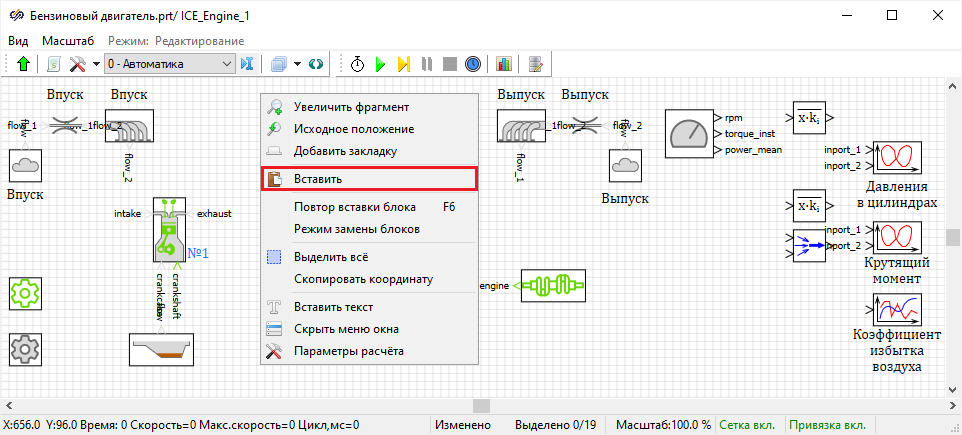 Рис. 26. Рабочая область проекта с выделенной кнопкой "Вставить" контекстного меню свободной области проекта. - Расположить скопированные блоки Цилиндр в соответствии с рисунком (Рис. 27)