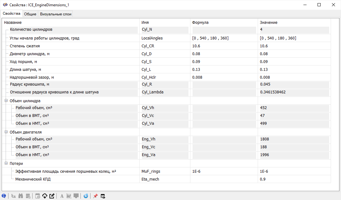 - 1 блок Геометрические характеристики из подменю Характеристики двигателя − позволяет задавать геометрические характеристики цилиндров двигателя