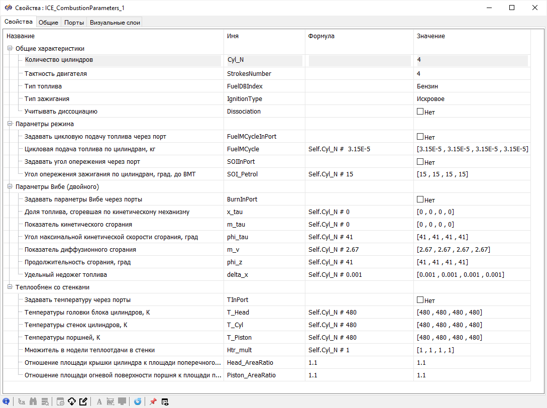 Открыть окно Свойства блока Характеристики сгорания и задать для свойства "Цикловая подача топлива по цилиндрам, кг" значение "Self.Cyl_N # 2.43E-5".