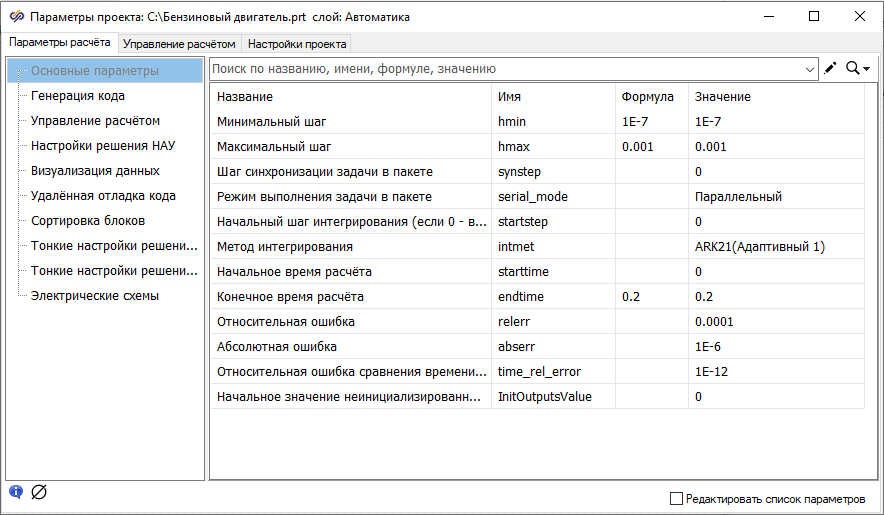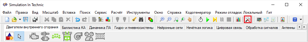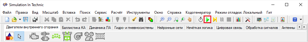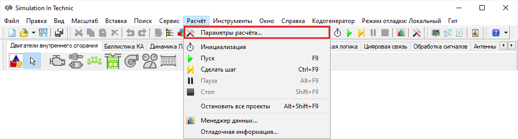 Рис. 34. Главное окно SimInTech с выделенной кнопкой "Параметры расчёта". - через меню главного окна программы, путем выбора из контекстного меню