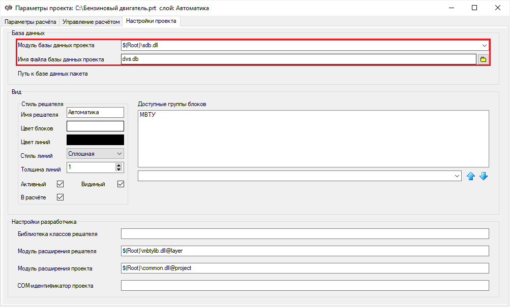 - "Модуль базы данных проекта" − "$(Root)\sdb.dll" − по умолчанию файл динамической библиотеки с функционалом базы данных