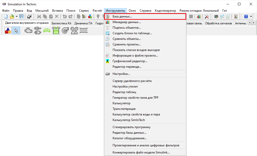 Рис. 38. Главное окно программы SimInTech с открытым меню "Инструменты" и выделенным пунктом "База данных".
