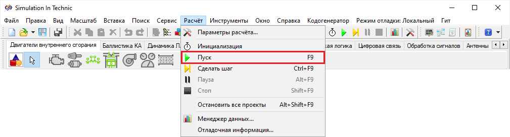 Рис. 35. Главное окно программы SimInTech c открытым меню "Расчёт" и выделенным пунктом "Параметры расчёта".