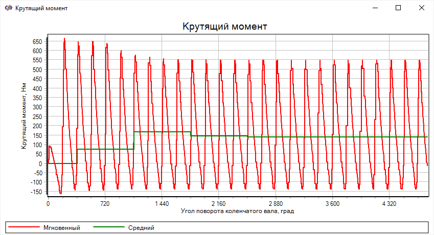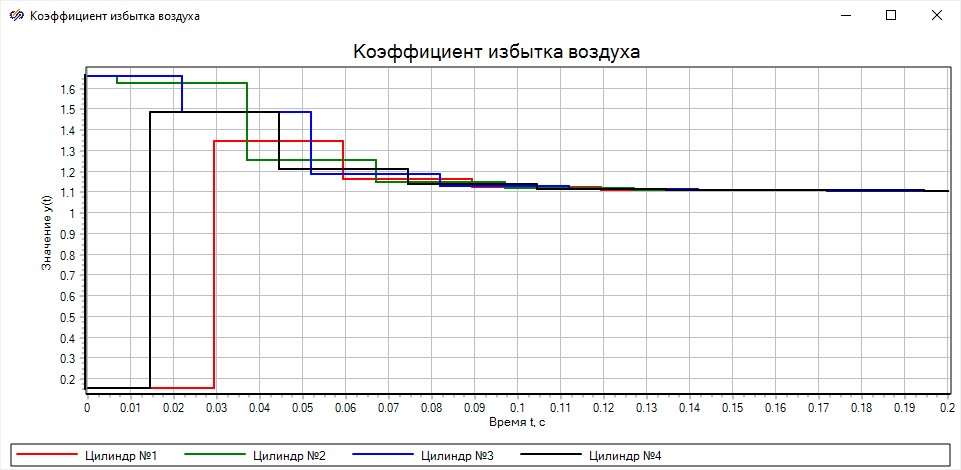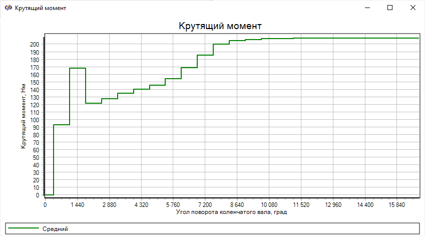 Графики имеют небольшой спад, который вызван тем, что во впускном коллекторе в качестве начального давления задано атмосферное давление, а в ходе моделирования давление снижается, появляется разрежение и в цилиндры поступает меньшее количество воздуха.