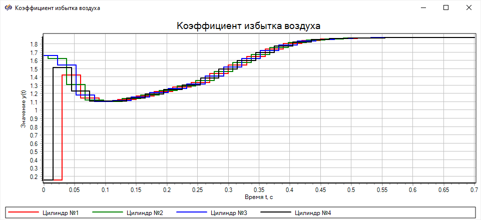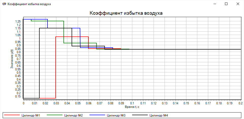 В установившемся режиме коэффициент избытка воздуха имеет значение 0.85 (Рис. 61) при установленном по умолчанию значении цикловой подачи топлива для каждого цилиндра 3.15E-5 кг (блок Характеристики сгорания свойство "Цикловая подача топлива по цилиндрам, кг" − "[3.15E-5 , 3.15E-5 , 3.15E-5 , 3.15E-5]"). Необходимо снизить цикловую подачу топлива, чтобы достичь значения 1.1. Тогда новое значение цикловой подачи будет рассчитано следующим образом: 3.15E-5 ˑ 0.85/1.1 = 2.43E-5 кг.
