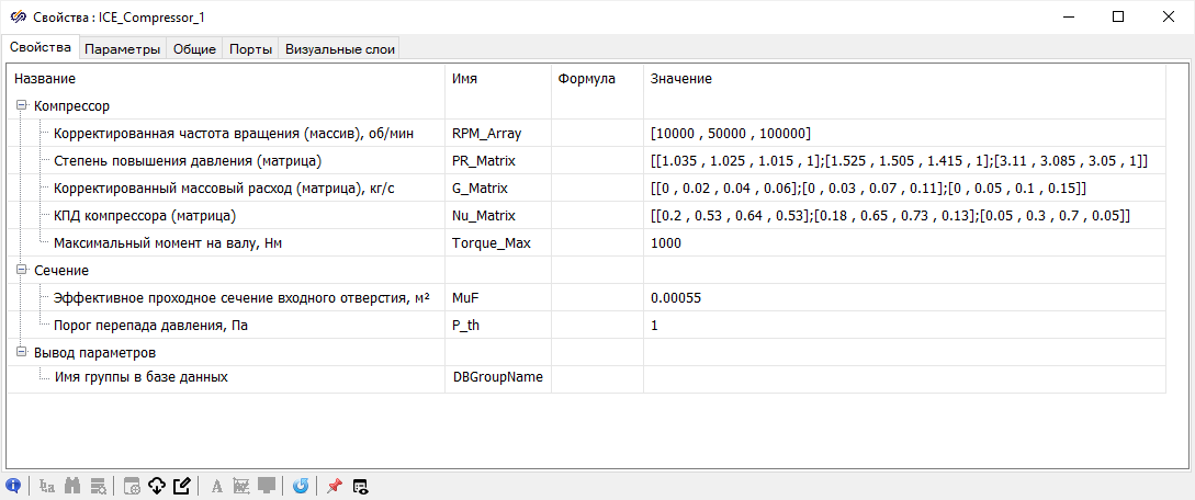Характеристики компрессора на каждой частоте вращения определены четырьмя точками, поэтому свойства "Степень повышения давления (матрица)", "Корректированный массовый расход (матрица), кг/с" и "КПД компрессора (матрица)" будут матрицами, содержащими 3 строки по количеству частот вращения и 4 столбца по количеству точек в изотахах. Каждая строка матрицы будет содержать значения соответствующей величины на одной изотахе. Свойству "Эффективное проходное сечение входного отверстия, м²" задается значение аналогичное свойству "Эффективная площадь проходного сечения дросселя, м²" удаленных блоков Дроссель.