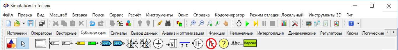 Рис. 4. Главное окно SimInTech с выбранной вкладкой "Субструктуры" в палитре блоков. - Одинарным нажатием левой кнопкой мыши выбрать блок Субмодель