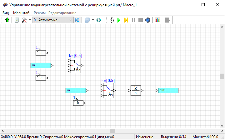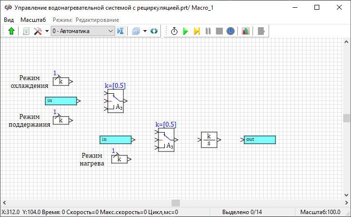 - 1 блок Интегратор из вкладки Динамические – данный блок вычисляет текущую температуру воды в нагревателе
