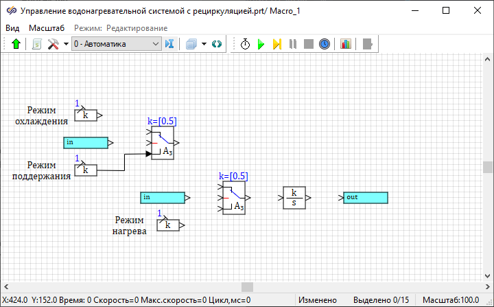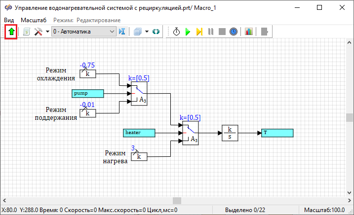 Необходимо разработать модель регулятора температуры воды, который должен поддерживать температуру в пределах Tзад ± 1°C, где Tзад – заданное значение температуры. На вход регулятора будет поступать текущее и заданное значения температуры, а на выходе формироваться сигнал состояния насоса и нагревателя.