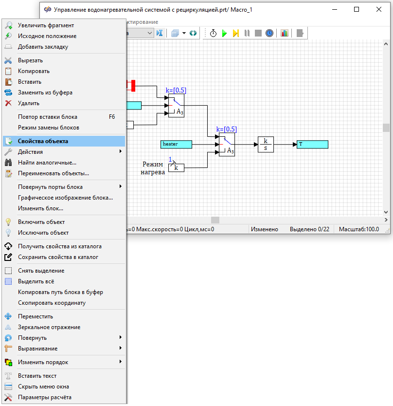 Рис. 13. Окно проекта с контекстным меню блока с выделенным пунктом "Свойства объекта". - Откроется окно Свойства, в котором задаются свойства блока (Рис. 14)