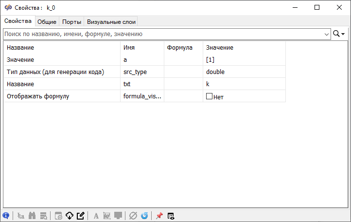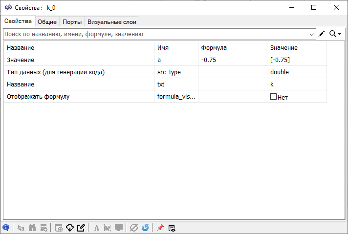 Рис. 14. Окно "Свойства" блока "Константа" со свойствами по умолчанию. - В поле "Формула" задать значение свойства "Значение" равным