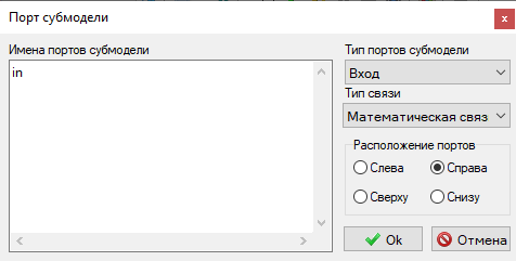Рис. 17. Окно "Порт субмодели" блока "Порт входа". - В области "Имена портов субмодели" заменить "in" на