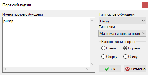 - Верхнему блоку Порт выхода следует поменять название порта на "pump". Этот порт необходим для передачи состояния насоса из субмодели