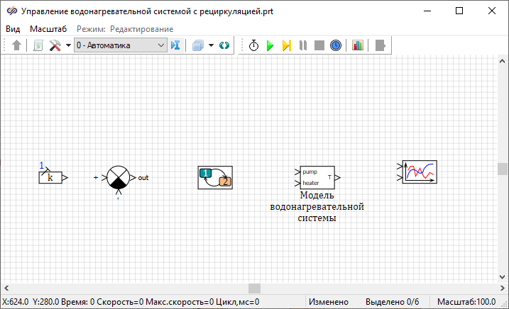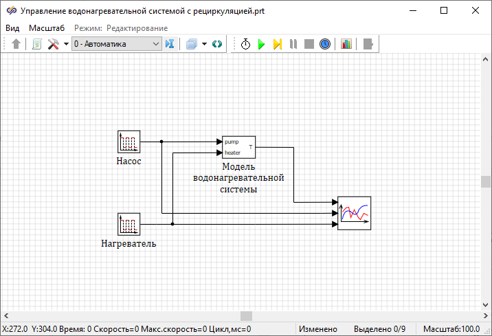 Необходимо разработать модель водонагревательной системы. Система состоит из нагревателя объемом 25 л и насоса.