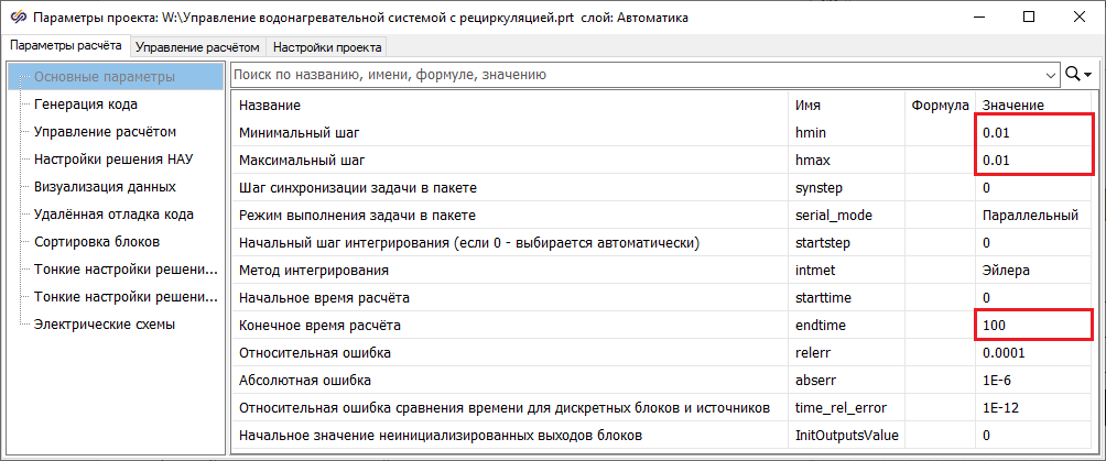 Также требуется изменить параметр "Конечное время расчёта" в Параметры расчёта на значение "1000".