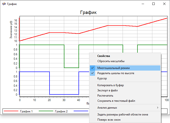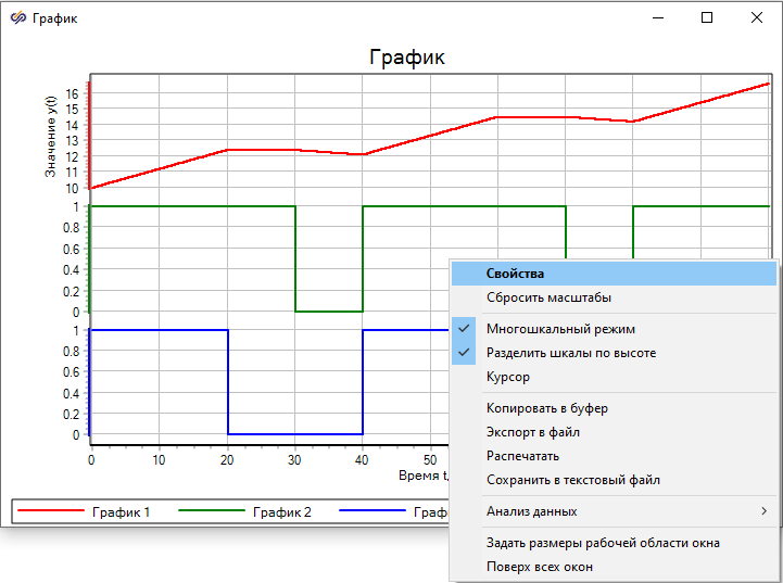 Необходимо изменить количество портов блока Временной график на схеме. Для этого требуется одинарным нажатием правой кнопкой мыши по блоку вызвать контекстное меню и выбрать пункт Свойства объекта. В открывшемся окне Свойства задать "Количество входных портов" равным "3".