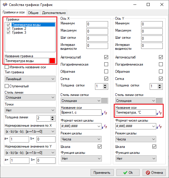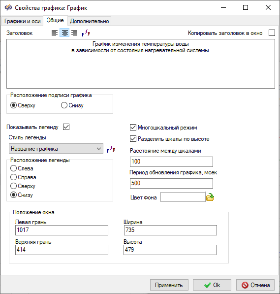 Рис. 30. Окно "Свойства графика" блока "Временной график". - Необходимо применить внесенные изменения. Для этого следует в области кнопок, расположенной в левой нижней части окна, нажать на кнопку Ok