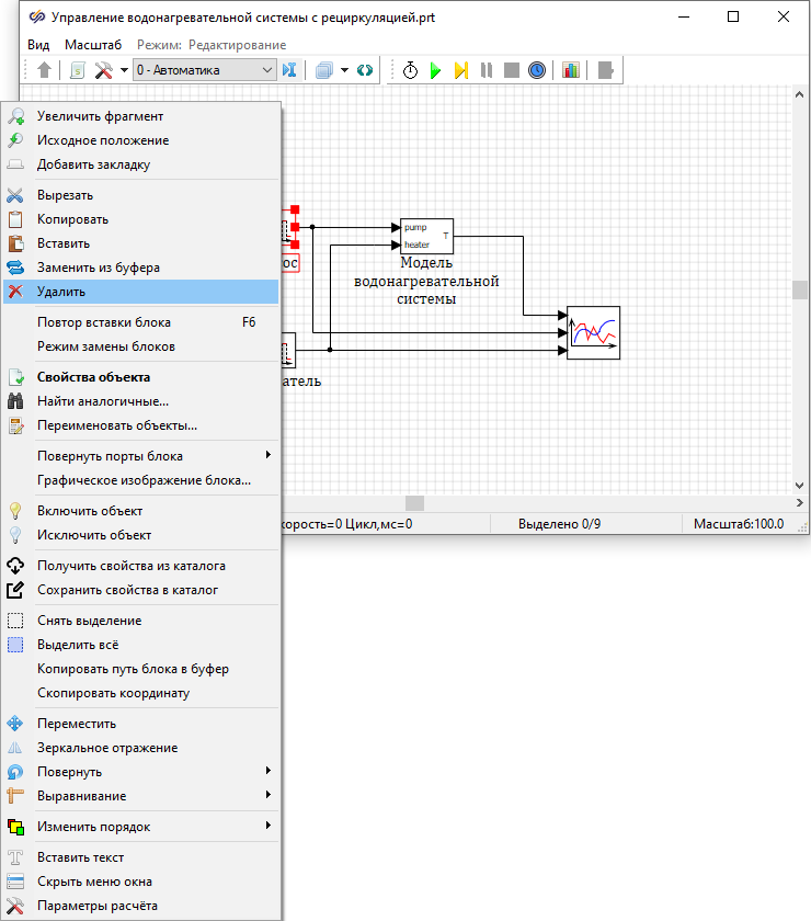 Рис. 32. Окно проекта с контекстным меню блока с выделенным пунктом "Удалить".