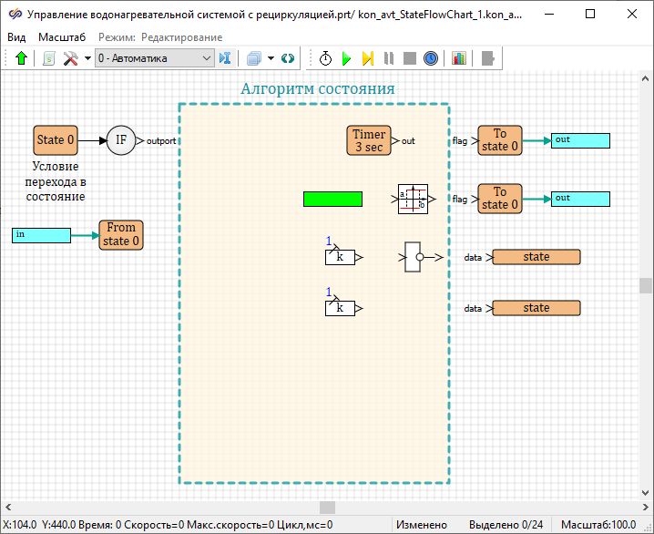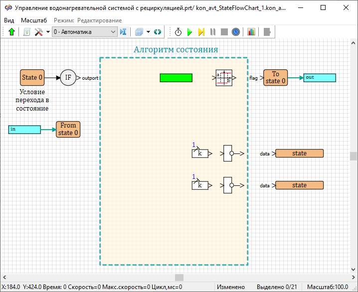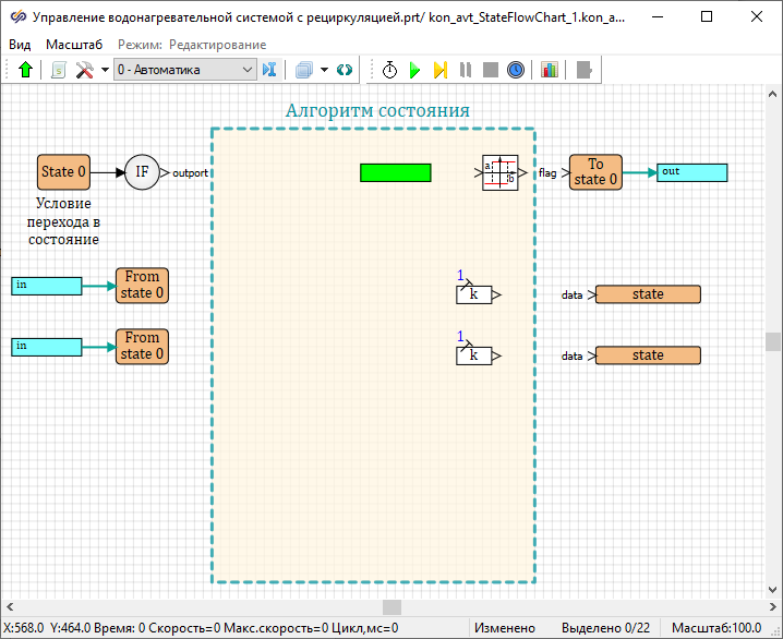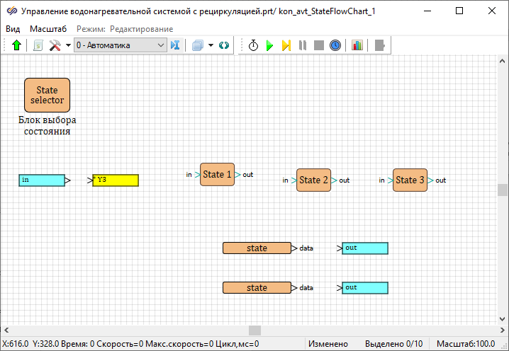 Разработка регулятора температуры воды с помощью конечных автоматов завершена. Необходимо выйти из рабочей области блока Карта состояний конечного автомата.