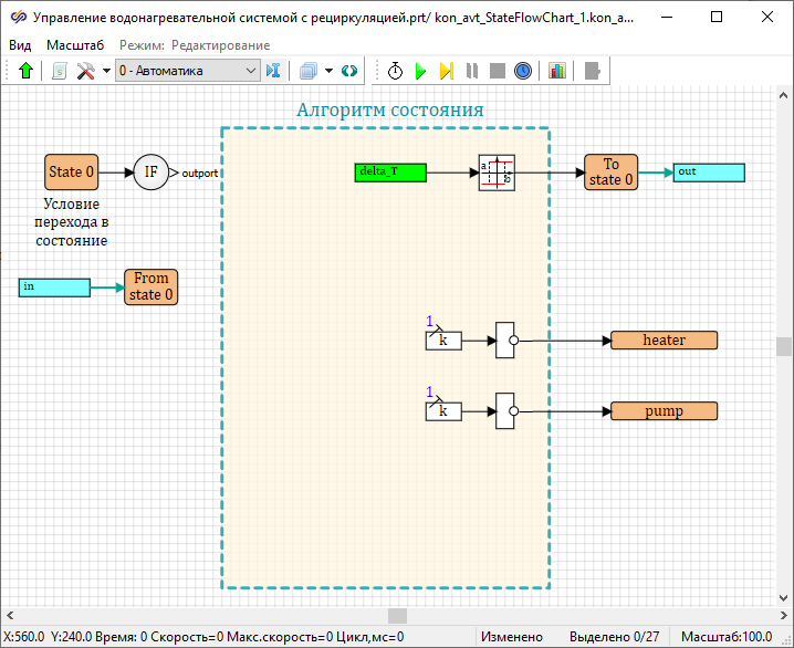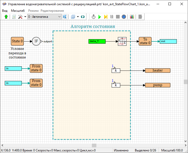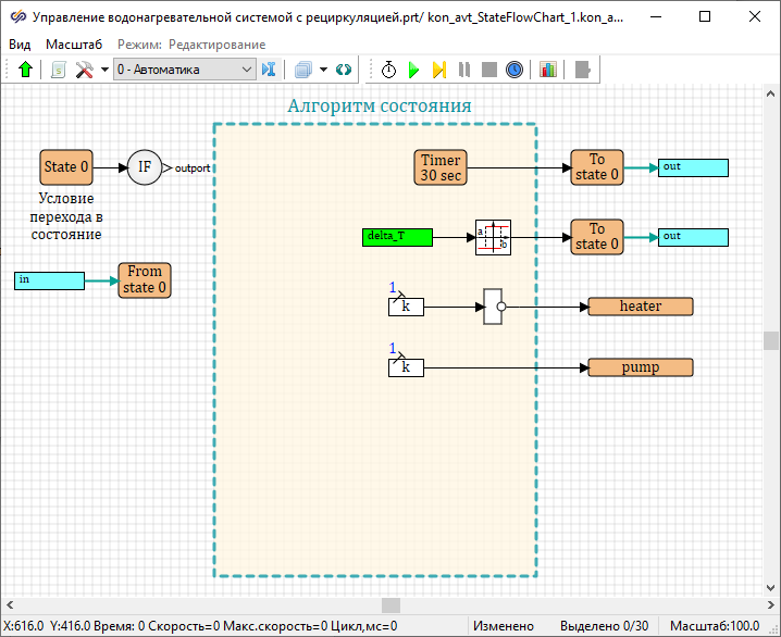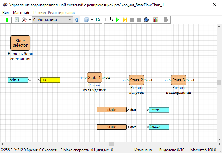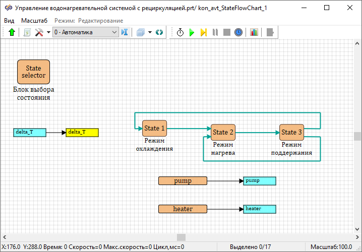 - Изменить имена данных состояний у блоков Выход данных состояния на "heater" и "pump"