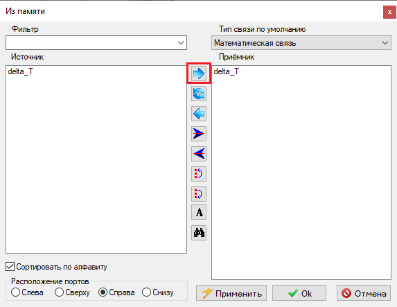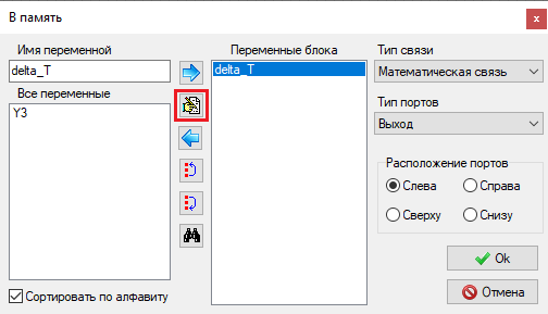 Рис. 40. Окно блока "Из памяти" с добавленной переменной "delta_T" и выделенной кнопкой "Добавить". - Нажать на кнопку Оk для применения внесенных изменений