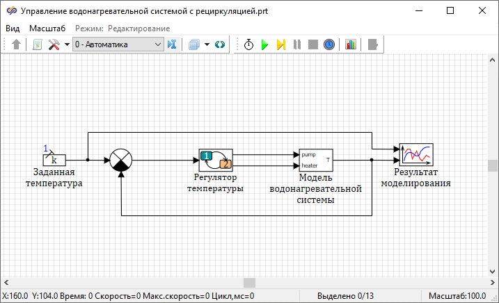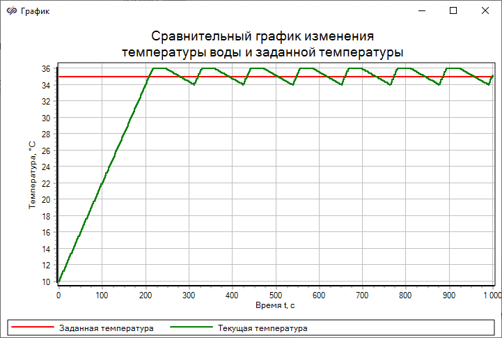 - Если нагреватель и насос выключены, то система находится в режиме охлаждения, и вода охлаждается со скоростью 0.5 град/с