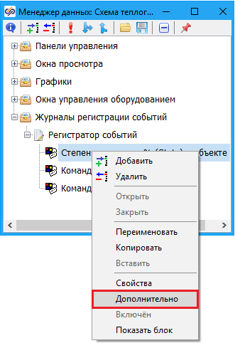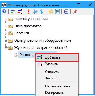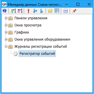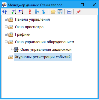 Убедитесь, что теплогидравлическая модель содержит ранее созданный журнал регистрации событий, для этого в главном окне программы нажмите кнопку Менеджер данных.