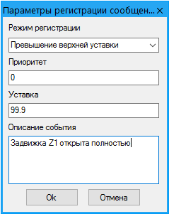 Режим регистрации Превышение верхней уставки Приоритет 0 Уставка 99.9 Описание события Задвижка Z1 открыта полностью - Нажмите на кнопку Ok, сохранив внесенные изменения.