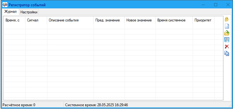 Для вызова окна Регистратор событий необходимо осуществить двойное нажатие на соответствующем пункте в окне Менеджер данных. При этом появится окно аналогичное изображенному на рисунке ниже (Рис. 8). Данное окно содержит в себе две вкладки: