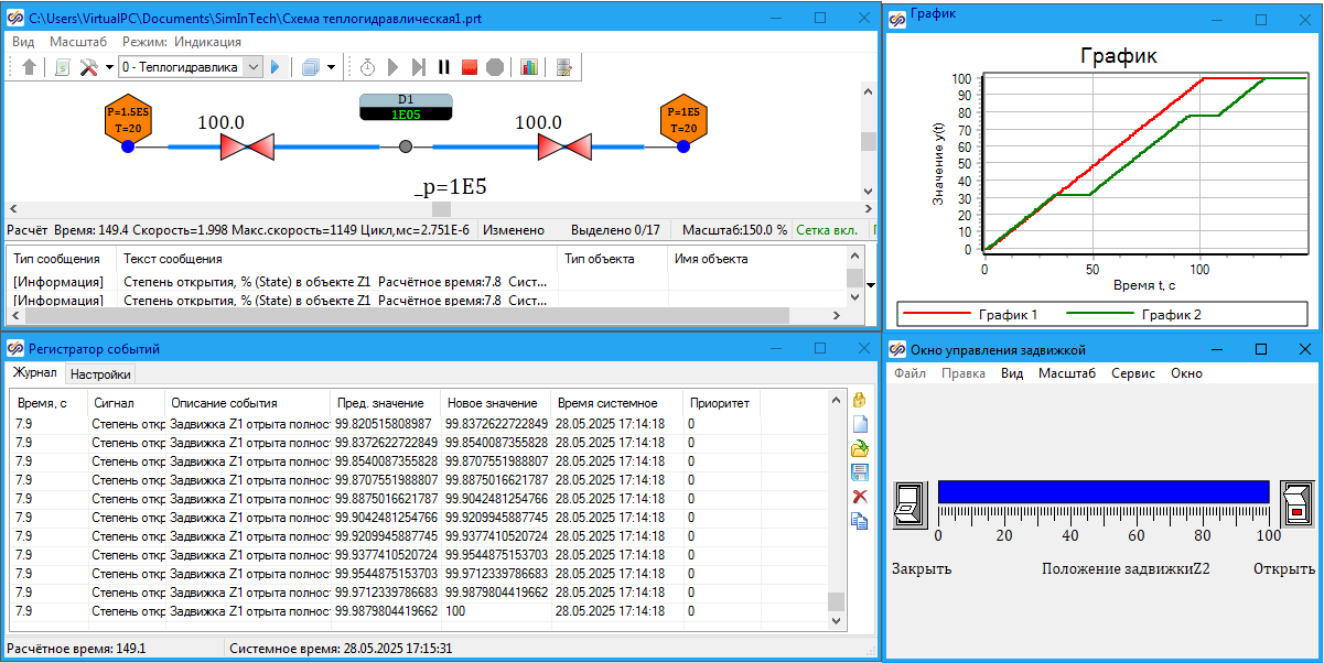 - Переведите задвижку "Z2" в полностью открытое состояние. Дождитесь, когда алгоритм управления задвижкой "Z1" выполнит необходимое открытие задвижки. Убедитесь, что для поддержания давления на уровне 117000 полное открытие задвижки Z1 не требуется и полное открытие не регистрируется журналом событий