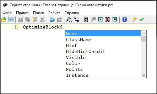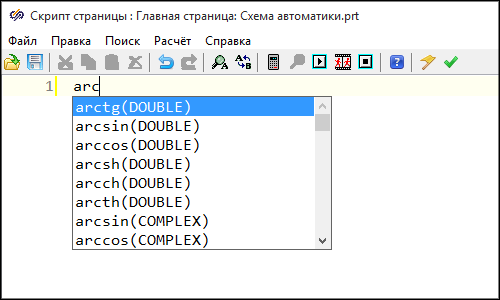 Дополнительной возможностью, упрощающей процесс написания текста скрипта является автодополнение имен переменных внутри контейнера, команд или функций. После начала ввода имени переменной, либо названия команды или функции, по нажатию комбинации клавиш Ctrl+Пробел открывается выпадающее меню, в котором предлагается список имен переменных, команд или функций, соответствующих введенным символам. Для функций также отображается подсказка по типам необходимых аргументов.