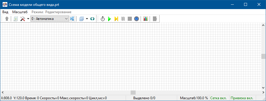 Схемное окно является основным интерфейсом, в котором происходит непосредственная работа при создании, редактировании любой расчетной схемы, при её запуске на расчет и отладке. При помощи в т.ч. схемного окна выводятся на графики, в файлы и в другие объекты менеджера данных результаты расчета, для их дальнейшего анализа. Управление расчетом (пуск, стоп, пауза и т.п.) продублировано также на панели инструментов схемного окна, для удобства работы.