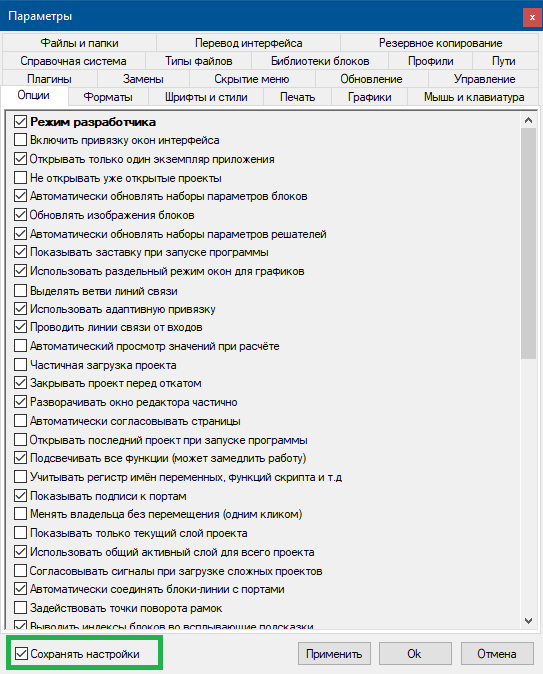 Настройки при выходе из SimInTech сохраняются автоматически, для следующего запуска программы с текущими настройками, если включена галочка "Сохранять настройки", как показано на рисунке: