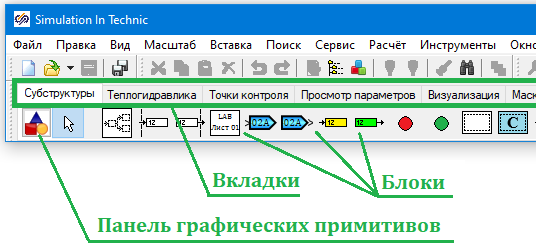 Кроме библиотек блоков, в палитре блоков представлена также панель графических примитивов, из