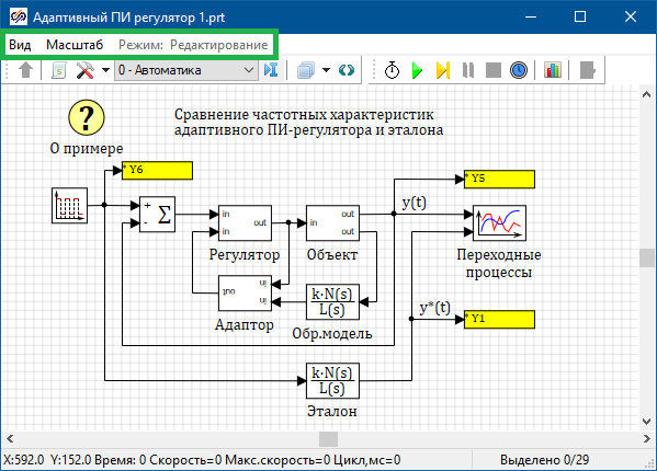 Меню схемного окна Рис. 1. Меню схемного окно (пример) Прим.: Меню схемного окна может быть скрыто из контекстного меню, появляющегося по нажатию правой кнопкой мыши на свободном месте схемного окна. Там же можно вновь включить отображение меню схемного окна.