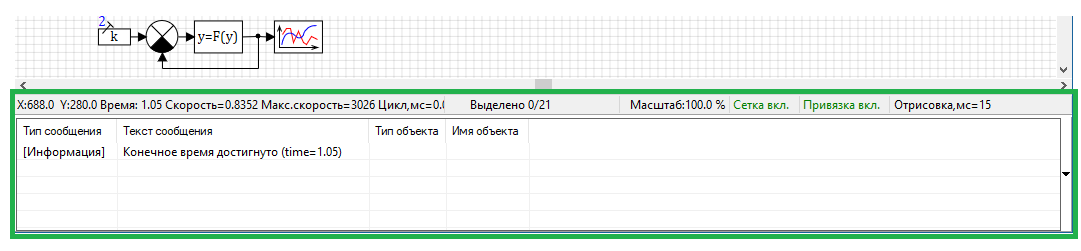 - ориентировочная скорость расчета и максимальная скорость расчета (это числа, показывающие коэффициент ускорения расчета относительно реального времени: если они больше 1, значит расчет идет быстрее реального времени в указанное число раз, если меньше 1 то медленнее);