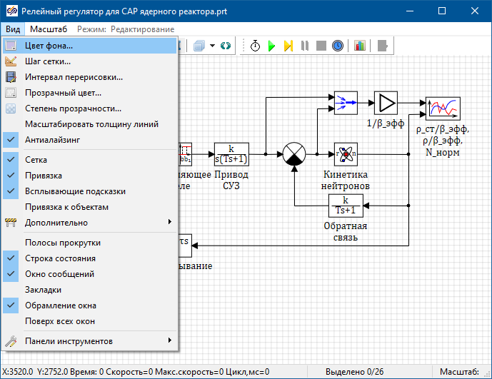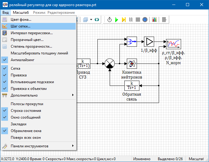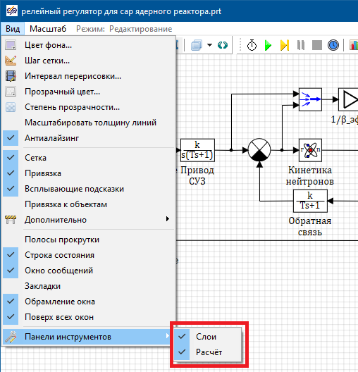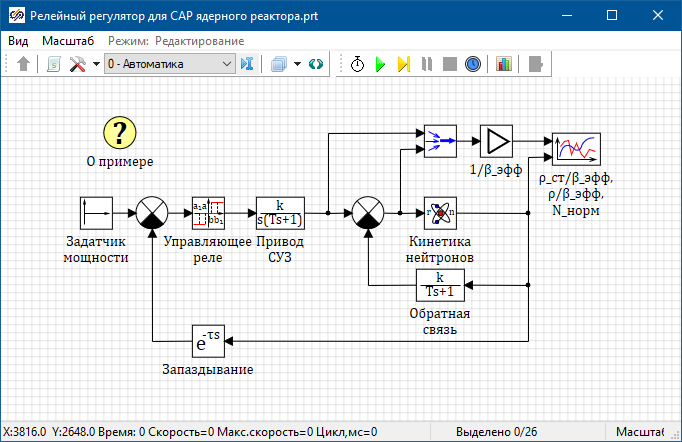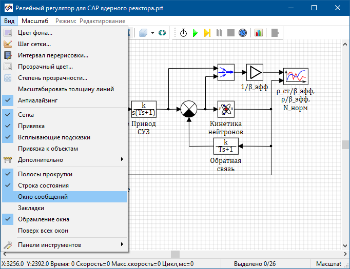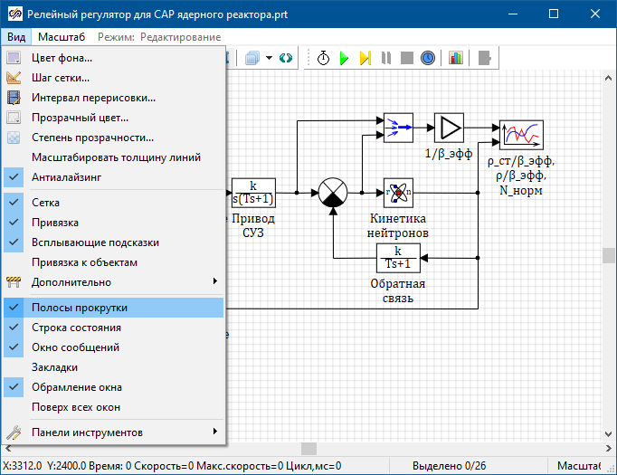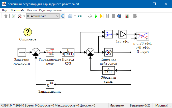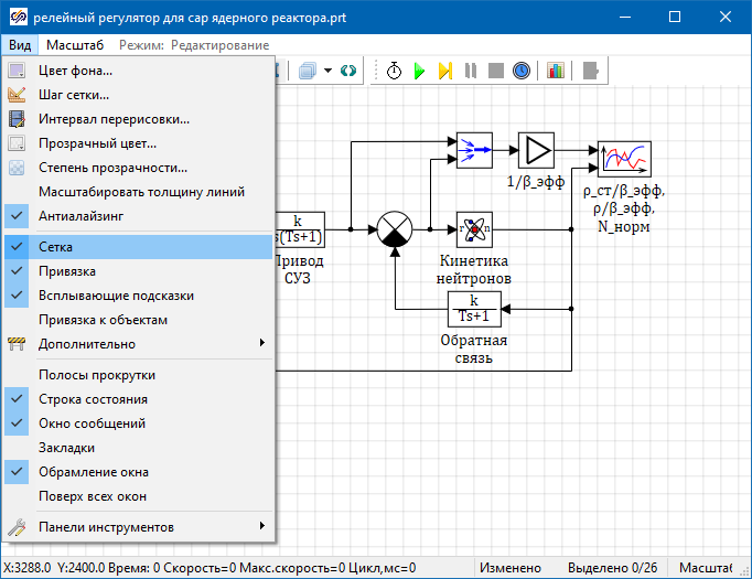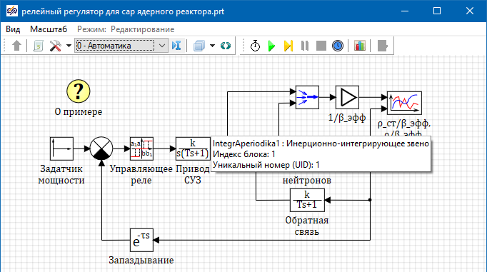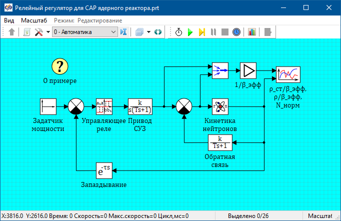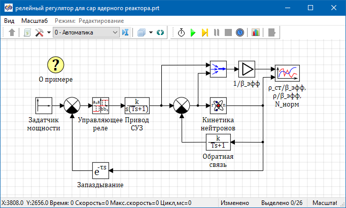 Для демонстрации возможностей по настройке Схемного окна будем использовать текущий проект "Релейный регулятор для САР ядерного реактора".