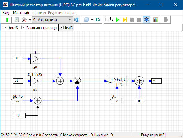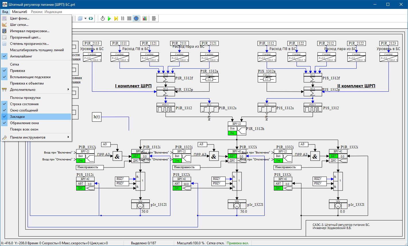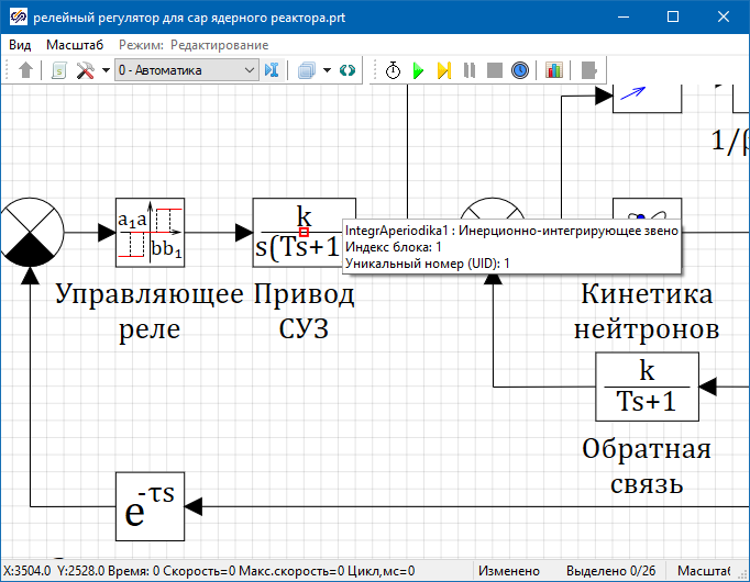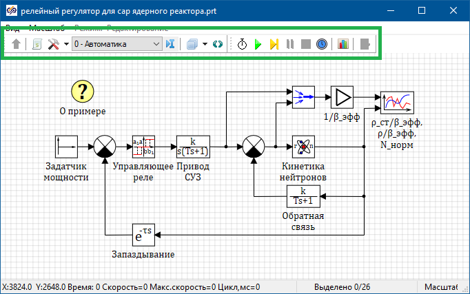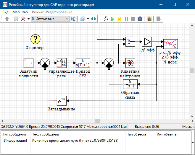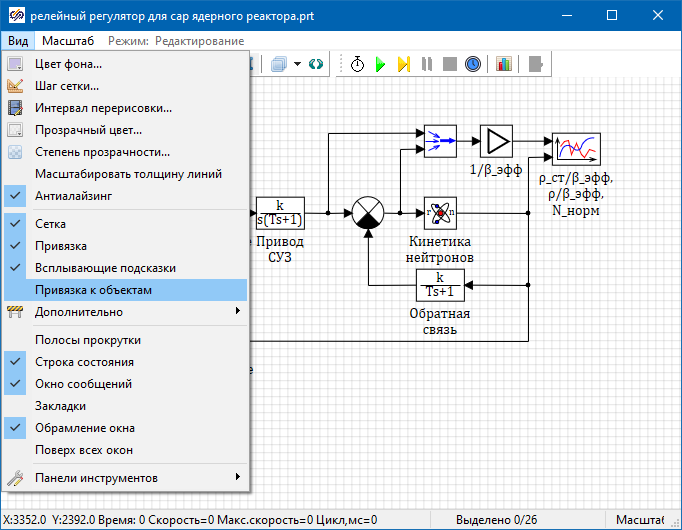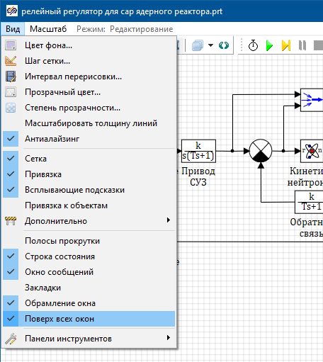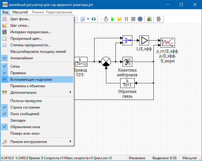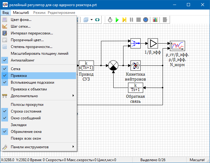 Для демонстрации возможностей по настройке Схемного окна будем использовать текущий проект "Релейный регулятор для САР ядерного реактора".