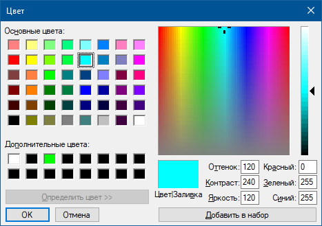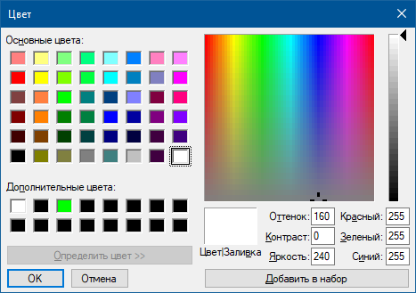 Далее следует добавить новый цвет в дополнительный набор, нажав кнопку "Добавить в набор", выделить новый цвет в разделе "Дополнительные цвета" и нажать кнопку "ОК". Цвет фона Схемного окна поменяется.