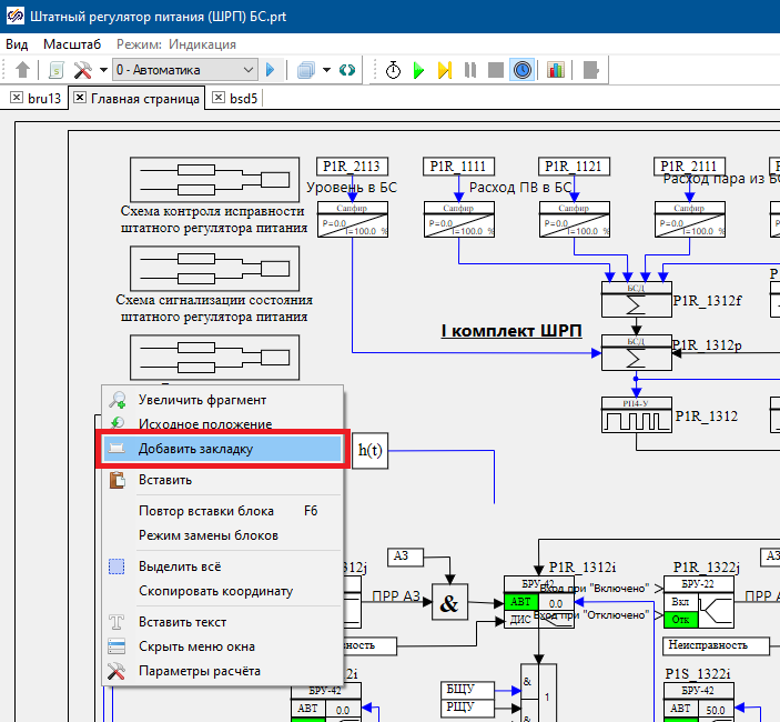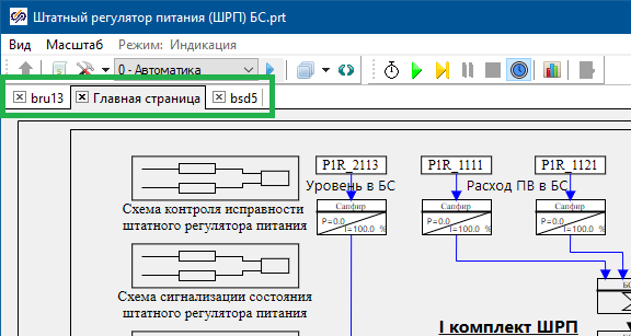 Покажем на примере проекта "ШПР – штатный регулятор питания" возможности применения опции "Закладки". Как видно на рисунке в результате включения опции на Схемном окне проекта отобразятся три закладки "bru13", "Главная страница", "bsd5":