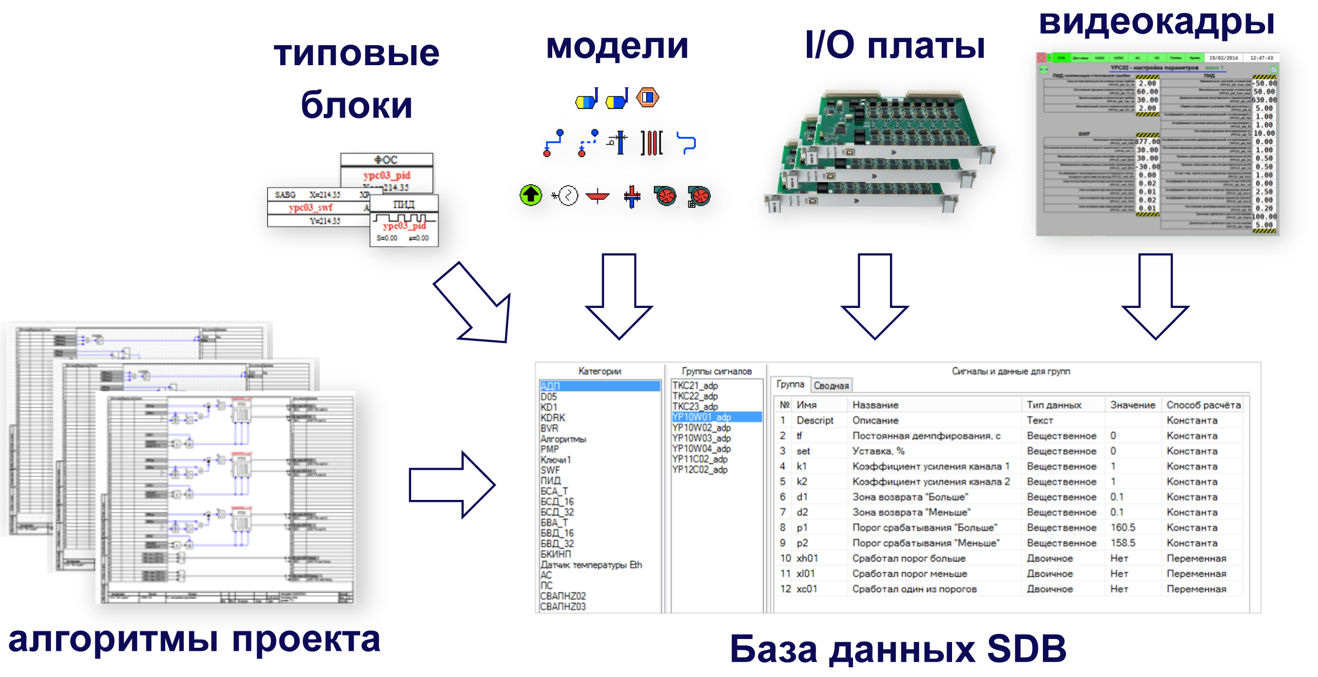 Такая организация имен сигналов позволяет в расчетной схеме создавать шаблонные алгоритмы или панели управления для категории сигналов, а также формировать типовые решения (алгоритмы) с векторной обработкой сигналов, поскольку все группы сигналов данной категории имеют разные начала полных имен сигналов и одинаковые окончания.