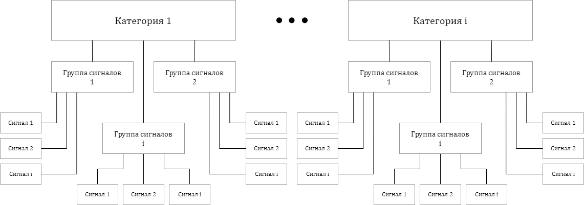 Для структурирования сигналов и обеспечения удобства поиска и доступа к ним, применяются два уровня хранения сигналов в базе: "Категория" и "Группа сигналов". Количество этих уровней определено проводимой аналогией с моделируемыми аппаратными сигналами, где категорией можно считать тип оборудования, а группой сигналов – конкретную аппаратную часть, конкретный экземпляр данного типа оборудования, внутри которой используется сигнал. Например, сигнал включения насоса с номером 1 будет располагаться в категории "Насосы" и в группе сигналов "Насос 1".