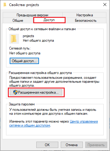 Рис. 10. Окно "Свойства" с выделенной вкладкой "Доступ" и кнопкой "Расширенная настройка...". - В окне "Расширенная настройка общего доступа" активируйте пункт "Открыть