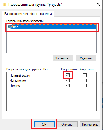 Рис. 13. Окно "Разрешения для группы" с выделенной группой "Все", пунктом "Полный доступ" и кнопкой "ОК". - Вернувшись в свойства общей папки, во вкладке "Доступ" нажмите кнопку "Общий
