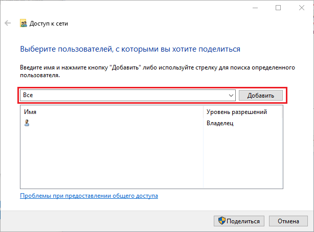Рис. 14. Окно "Доступ к сети" с выделенным полем для добавления пользователей, в котором выбрана нужная группа пользователей. - После появления группы "Все" в окне общего доступа в столбце "Уровень