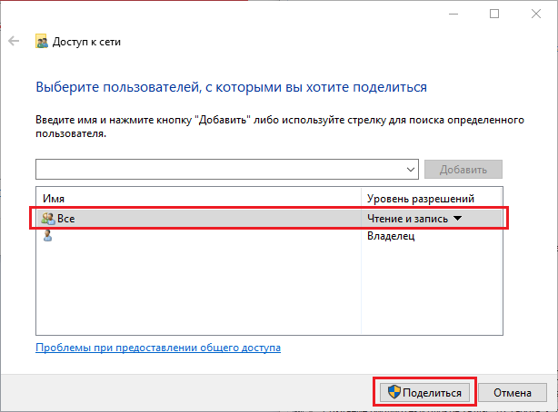 Рис. 15. Окно "Доступ к сети" с выделенной строкой группы пользователей "Все" и кнопкой "Поделиться". - В случае успешного предоставления доступа к папке появится соответствующее окно.