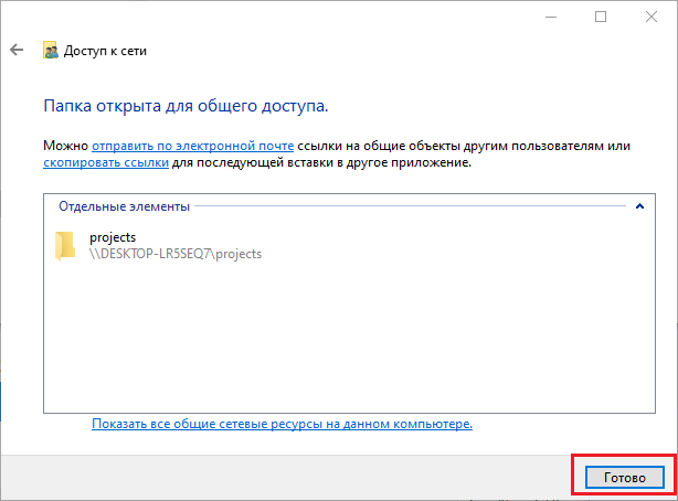 Закройте его путем нажатия кнопки "Готово" (Рисунок 16). Открытое ранее окно свойств общей папки закрыть путем нажатия