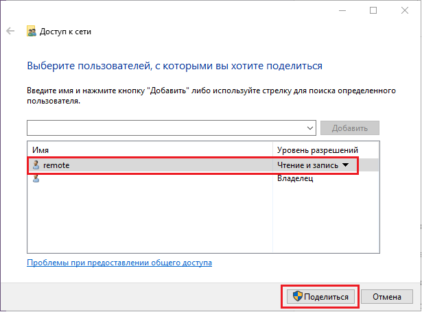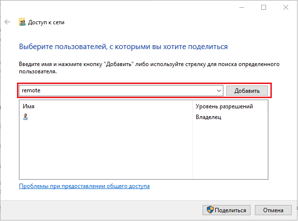 Рис. 18. Окно "Доступ к сети" с выделенным полем для добавления пользователей, в котором выбран нужный пользователь. - После появления имени пользователя в окне общего доступа в столбце "Уровень
