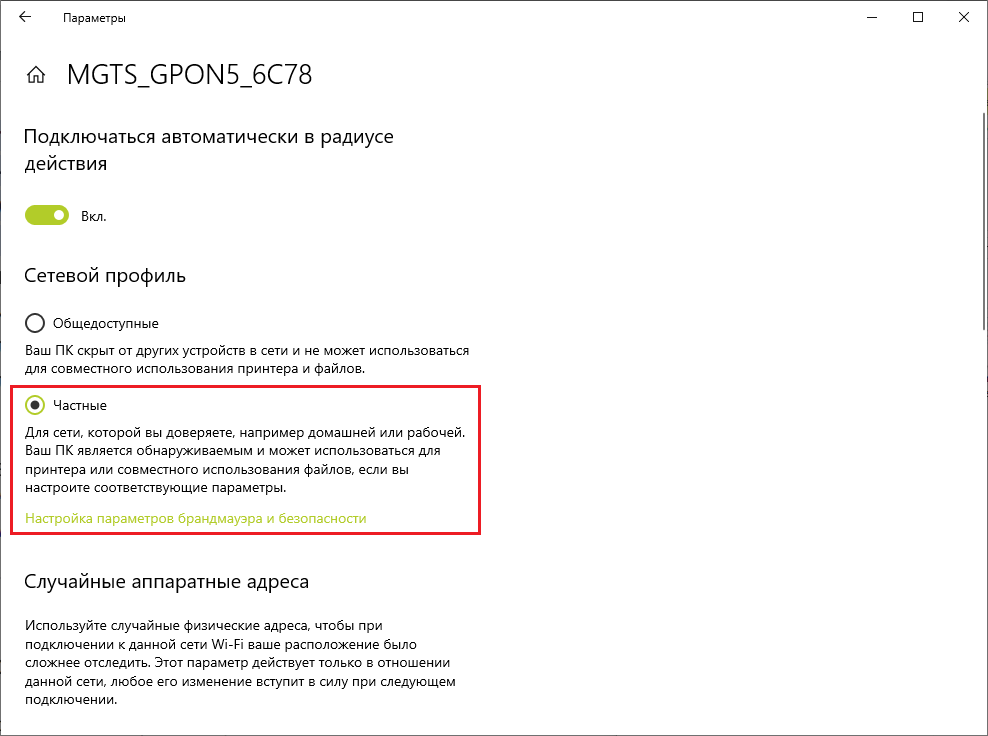 Рис. 2. Окно "Параметры" с выбранным пунктом "Частные". - Откройте "Панель управления" и перейдите в раздел "Сеть и Интернет"